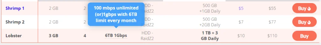 - Bandwidth : 100 Mbps unlimited or 1Gbps for first 6TB/mo. then 10 Mbps unlimited.